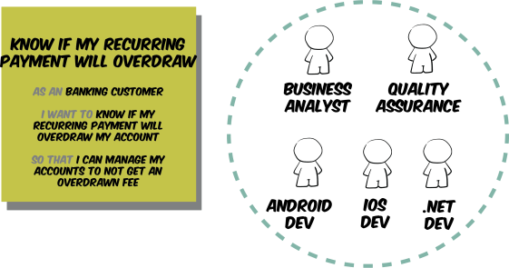 A feature for this type of team would be “As a banking customer, I want to know if my recurring payment will overdraw my account, so that I can manage my accounts to not get an overdrawn fee”. The feature goes to only this one team to deliver.